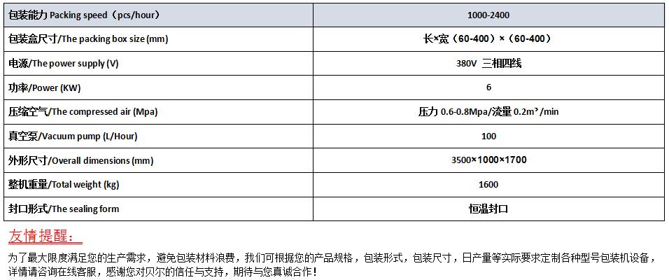 二、應用范圍 熱成型氣調包裝機廣泛用于生熟肉、禽、魚以及果蔬等休閑食品,面包、糕點和盒飯等食品的盒式包裝和袋式包裝,它利用CO2、O2、N2等保護性混合氣體所起的不同作用,有效抑制微生物生長繁殖。經過氣調包裝的食品,較好地保持了食品原有的口感、色澤、形狀及營養,同時可達到較長的保鮮期。 三、性能特點及原理 (1)本機適合各式食品的盒式包裝,連續自動完成抽真空、自動混合保鮮氣體(通常為CO2、N2、O2)、充氣、封口包裝、分切,包裝成品排出等步驟; (2)可完成復合膜、單膜、共擠膜等不同材質的包裝膜和包裝盒進行封口包裝; (3)伺服電機驅動,由可編程序控制器(PLC)配合觸摸屏實現人機界面對話,各部分動作及控制參數均可由PLC設定、修改。控制方便可靠,精確靈活,故障率低; (4)整體式鋁合金側板支架(貝爾國家專利號ZL2004 2 0039098 3),強度高,直線度好,主體采用SUS304食品級不銹鋼材料制造,設備表面易清洗; (5)封口壓力、溫度和時間等參數可以精確控制,確保產品封口達到理想效果; (6)光電跟蹤蓋膜圖案,確保包裝印刷圖案的完整; (7)模具形狀可按客戶選定的包裝盒樣式進行定制; 四、主要技術參數 見附件